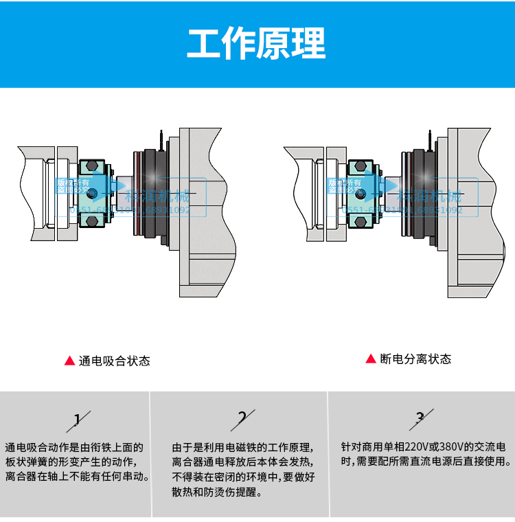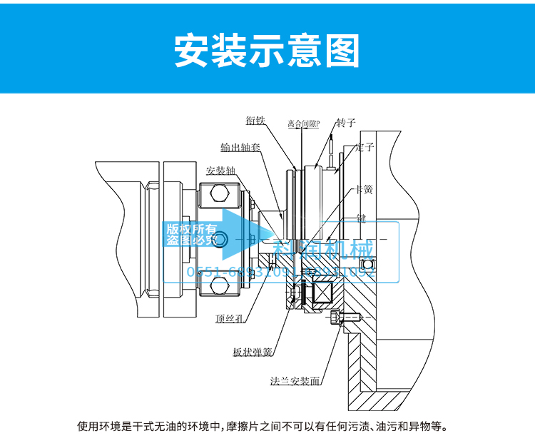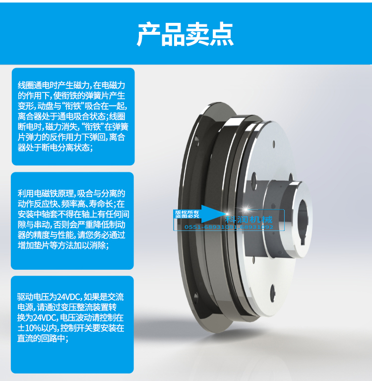 軸承和法蘭安裝干式24V電磁離合器通常是關閉的類型, 并要求直流電壓的操作。當定子提供直流電壓時, 電樞板被吸引到轉子上的摩擦材料的空氣間隙和扭矩得到傳遞沒有反彈。當電源關閉時, 預應力彈簧把電樞拉回原來的位置, 即使在垂直安裝時也沒有剩余扭矩。